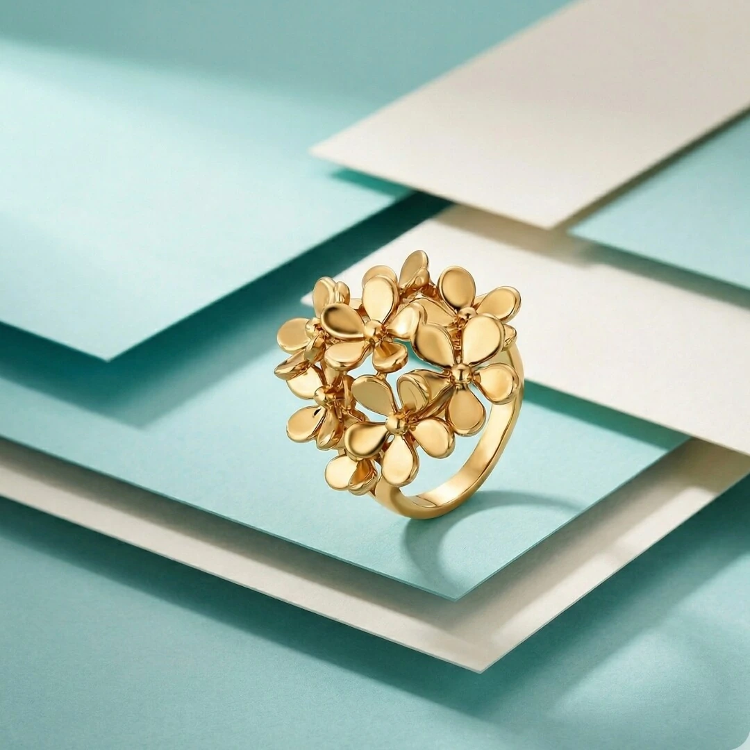 O Anel Flores Fosco Acetinado da Coleção Duna traz o mesmo DNA floral e contemporâneo da coleção em uma peça para as mãos — flores sobrepostas com acabamento fosco acetinado e Banho de Ouro 18k que cria um visual suave, sofisticado e completamente único.