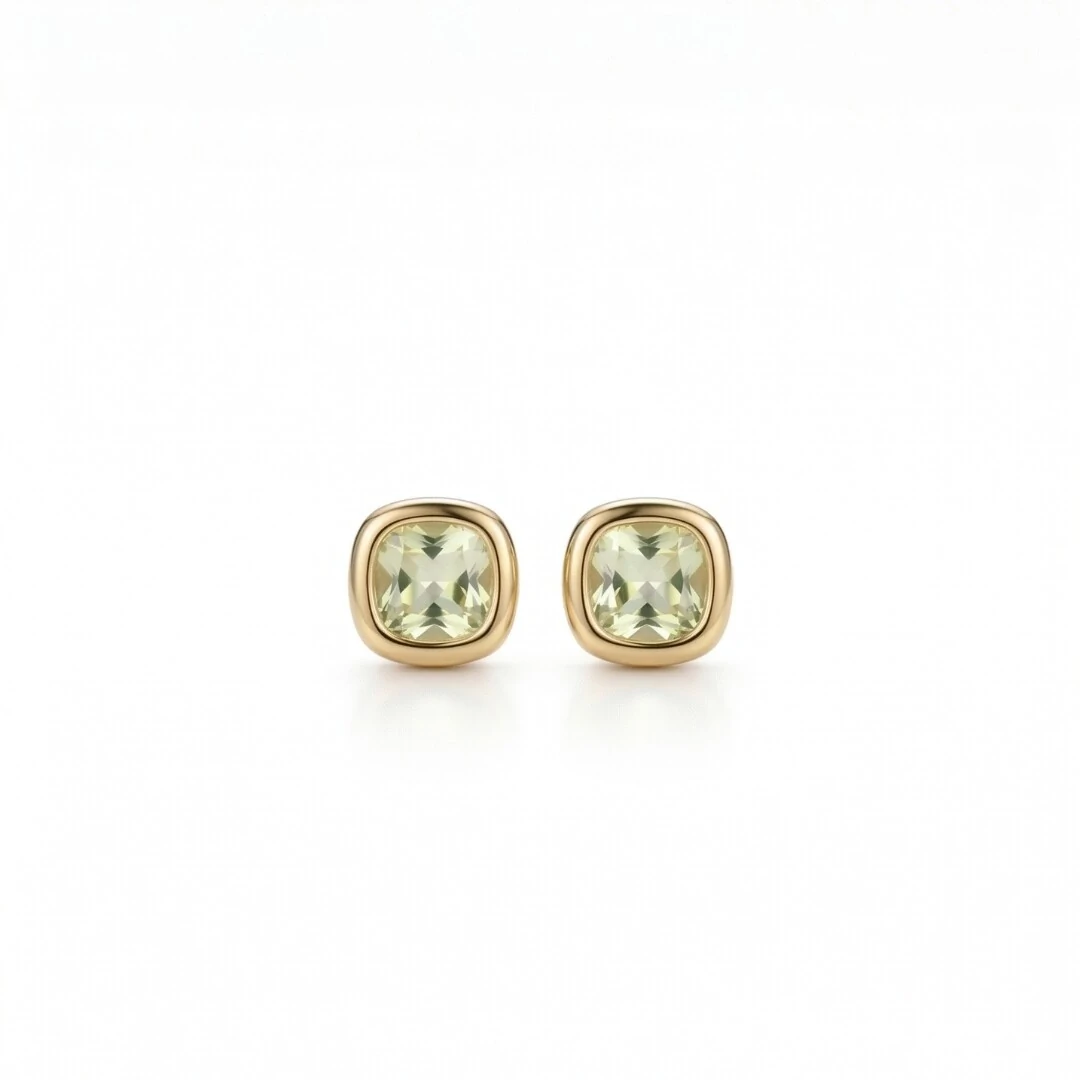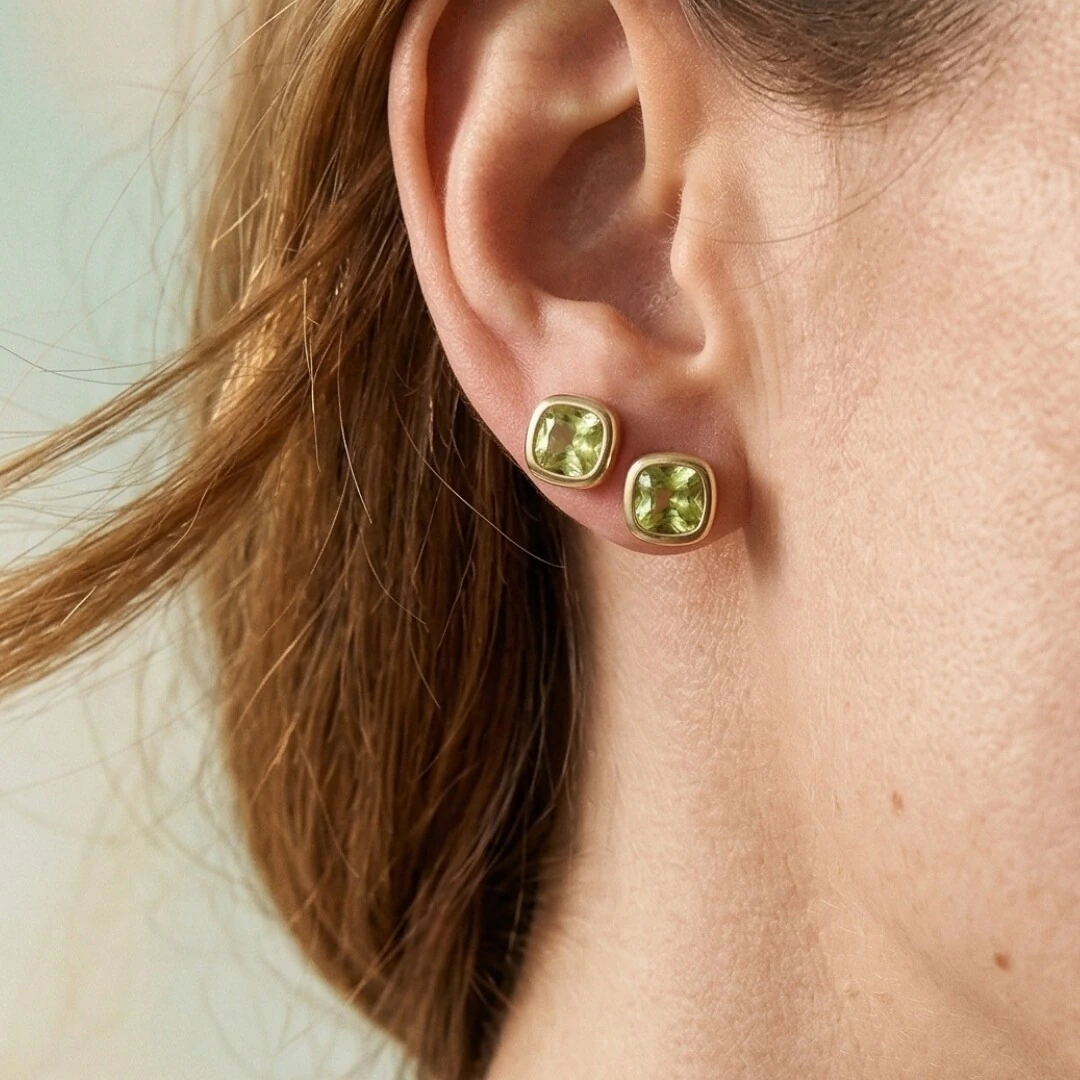 O Brinco Quadrado Cristal Verde Claro em Banho de Ouro 18k traz uma pedra de cristal 7mm em cravação bezzel — a moldura lateral em metal dourado emoldura a pedra sem garras, criando um visual clean, contemporâneo e sofisticado.