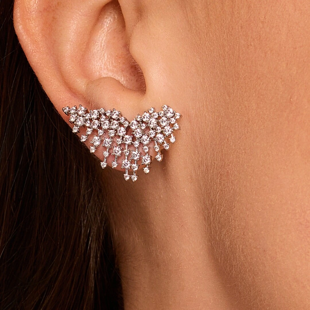O Ear Cuff Cometa Zircônias em Ródio Branco é uma peça de impacto — zircônias dispostas em cascata formam a cauda de um cometa que se estende pelo lóbulo, criando um efeito visual dramático e sofisticado que chama atenção sem esforço.