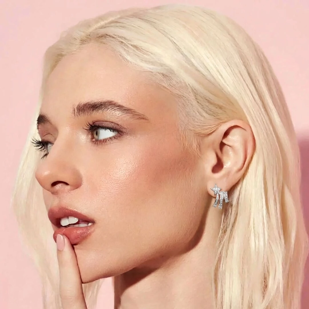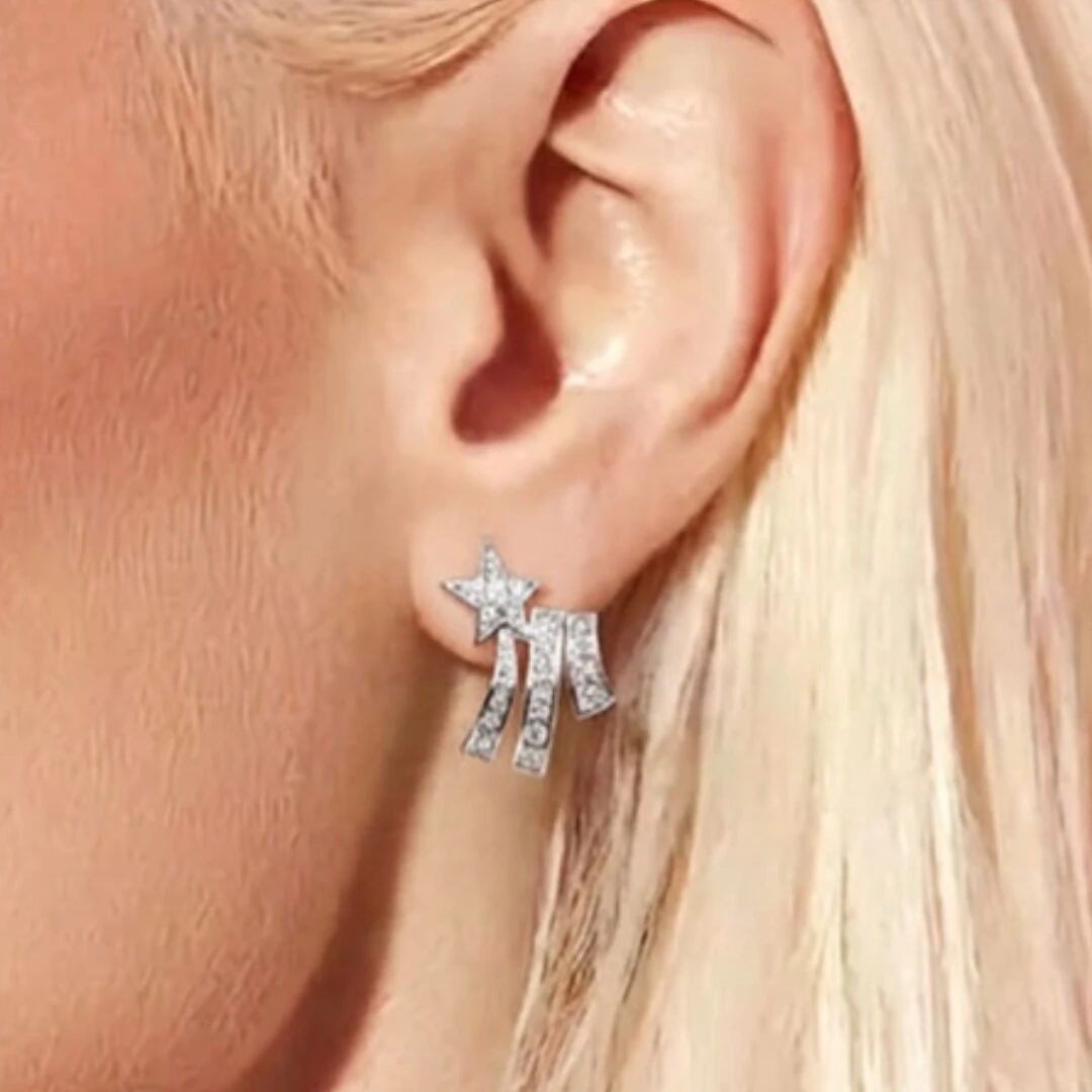 O Brinco Estrela Cadente Zircônias em Prata 925 com Banho de Ródio Branco traz o design de uma estrela cadente em movimento — a estrela cravejada de zircônias no topo e três colunas brilhantes que simulam o rastro luminoso no céu, criando uma peça delicada, cheia de significado e impossível de ignorar.