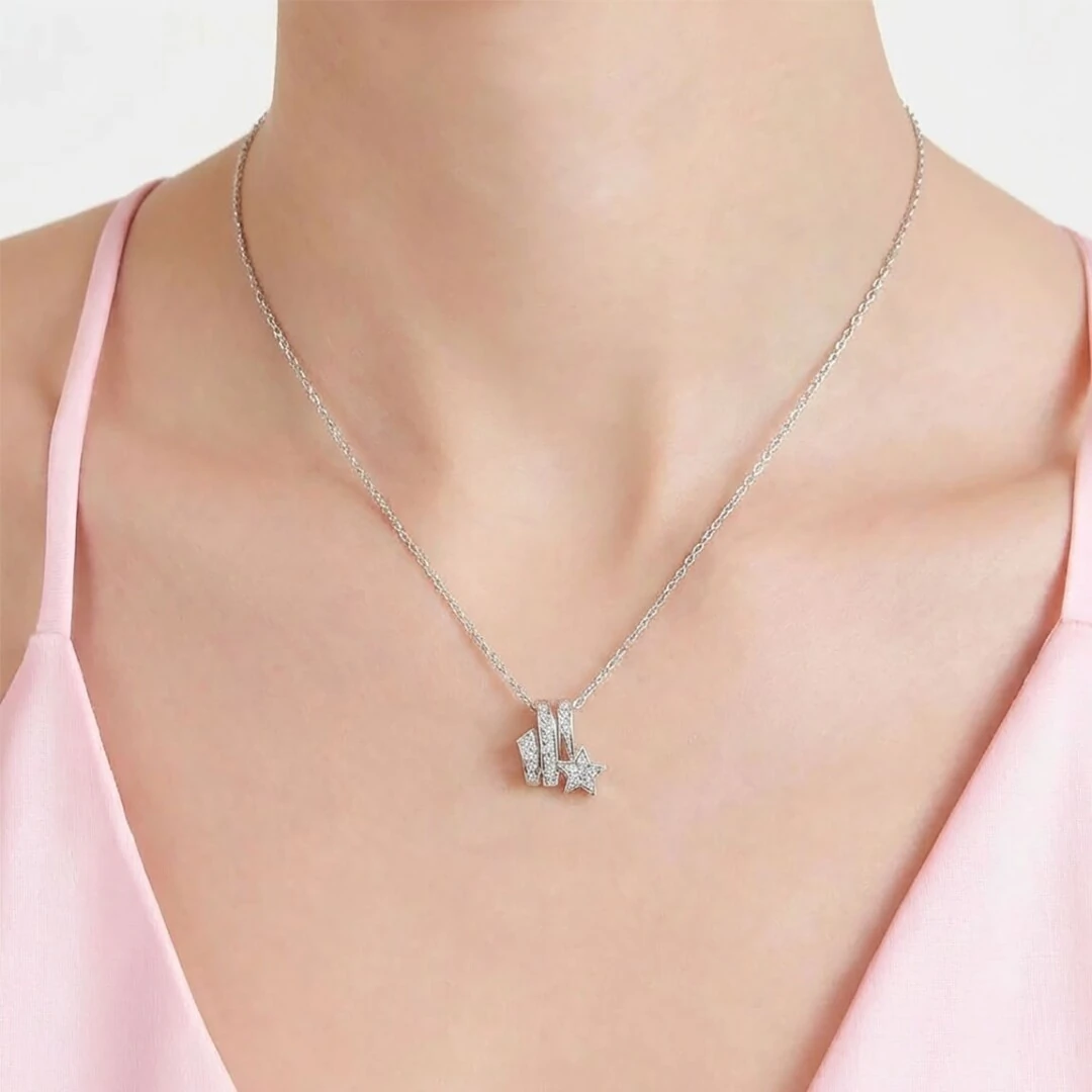O Colar Estrela Cadente Zircônias em Prata 925 com Banho de Ródio Branco traz um pingente delicado de estrela vazada cravejada de zircônias — um design que captura leveza e movimento, perfeito para quem quer adicionar brilho e personalidade ao look do dia a dia.