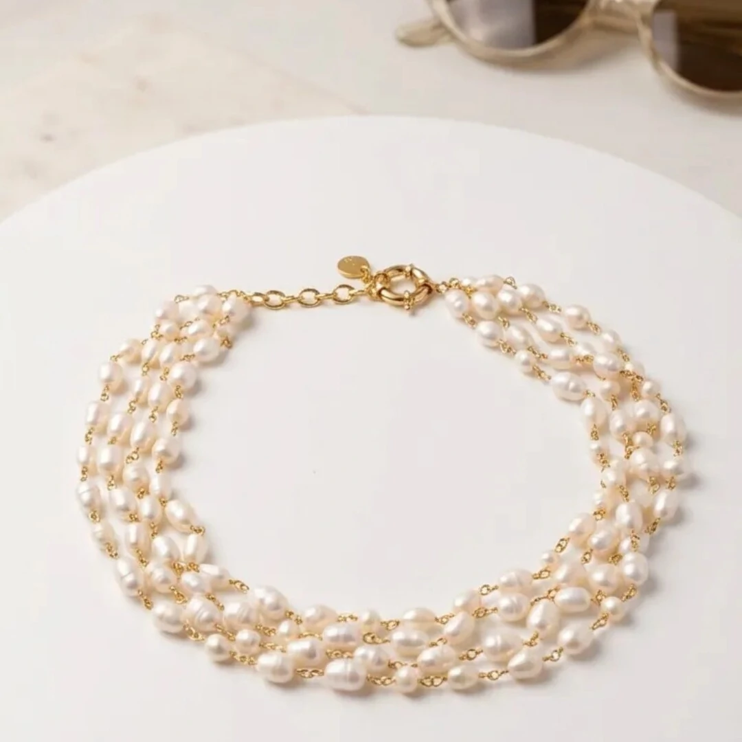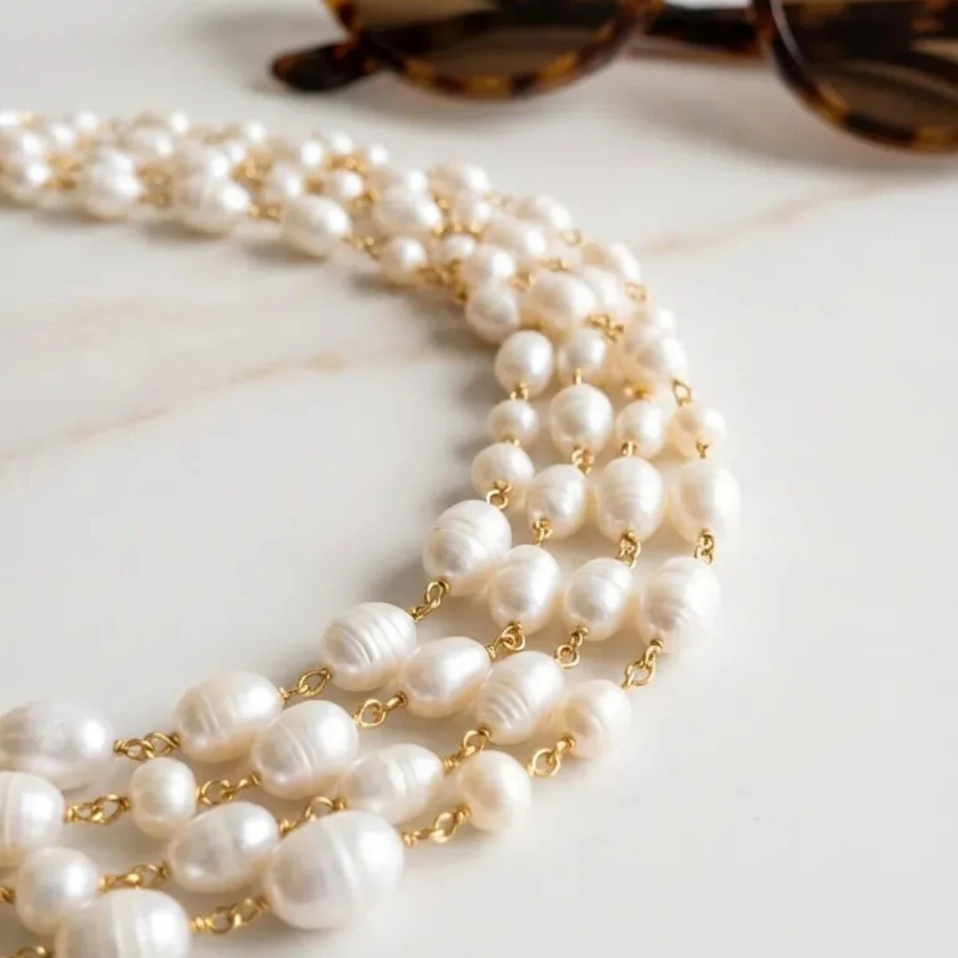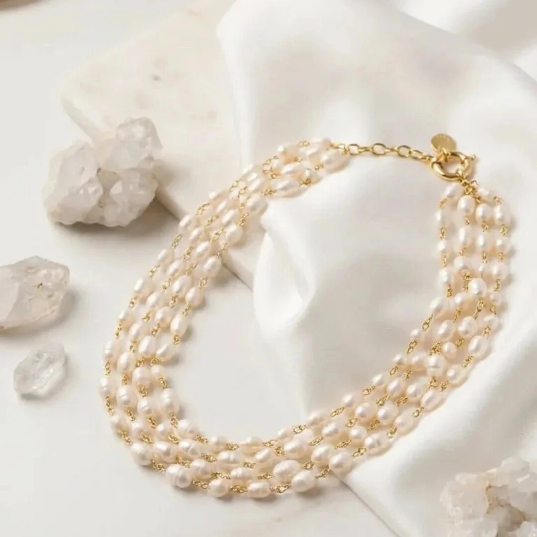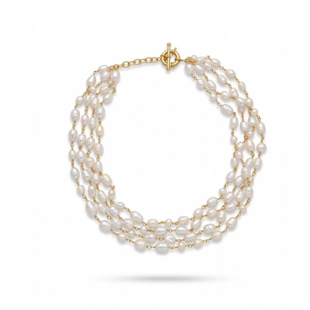 O Colar 4 Fios Pérola de Água Doce em Banho de Ouro 18k traz quatro fios de pérolas naturais de água doce intercalados em corrente dourada — cada pérola com seu brilho nacarado único, criando um volume suave e sofisticado que transforma qualquer decote em uma composição editorial.
