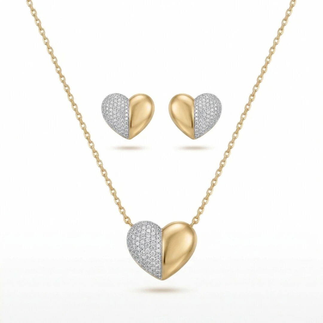O Conjunto Heart em Banho de Ouro 18k apresenta um design inédito — cada peça coração é dividida em duas metades: uma fosca acetinada e uma cravejada de zircônias. A tensão entre o dourado suave e o brilho intenso das pedras cria uma composição visual sofisticada e completamente única no mercado.
