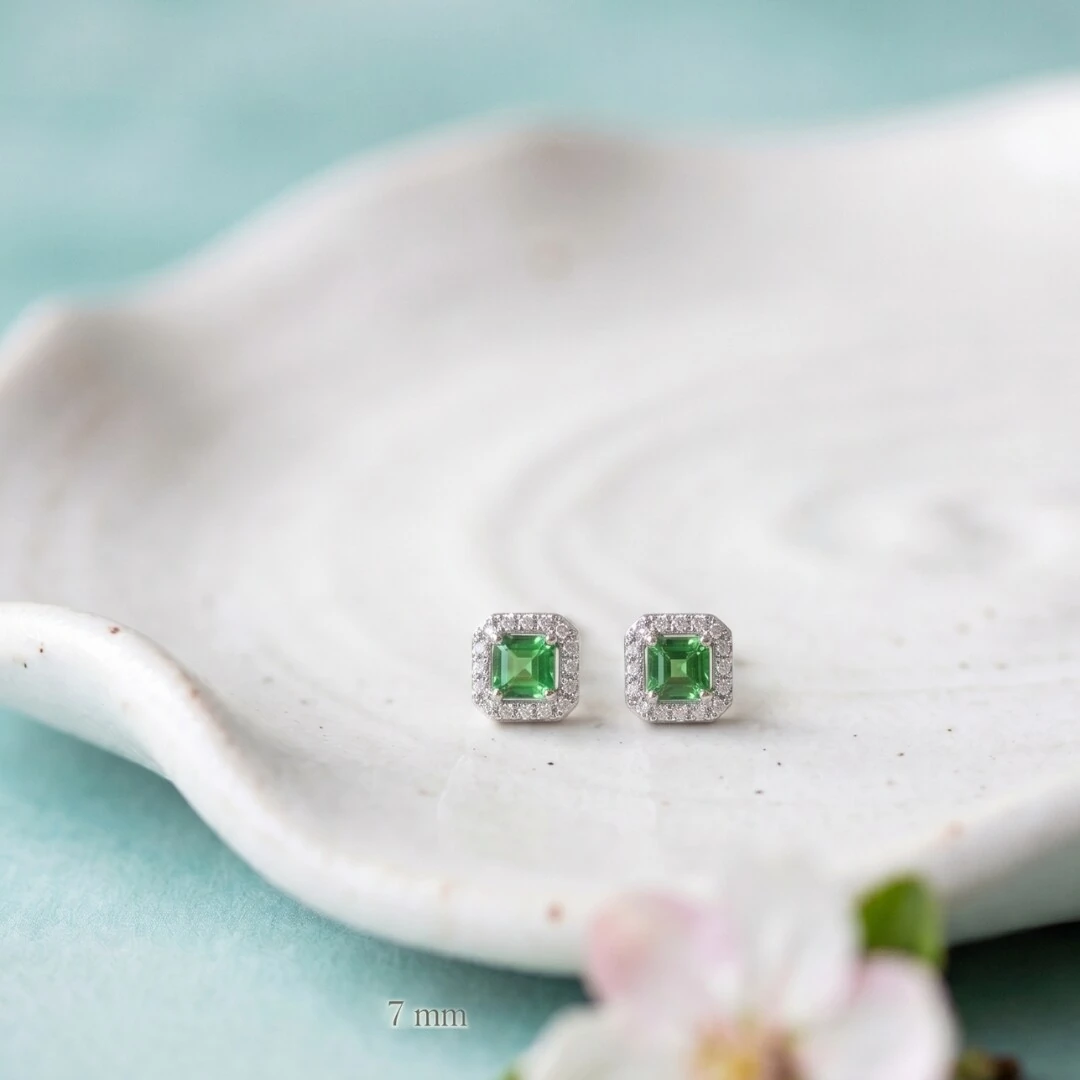 Brinco Quadrado Zircônia Esmeralda com Halo | Prata 925 com Ródio Branco | 7mm