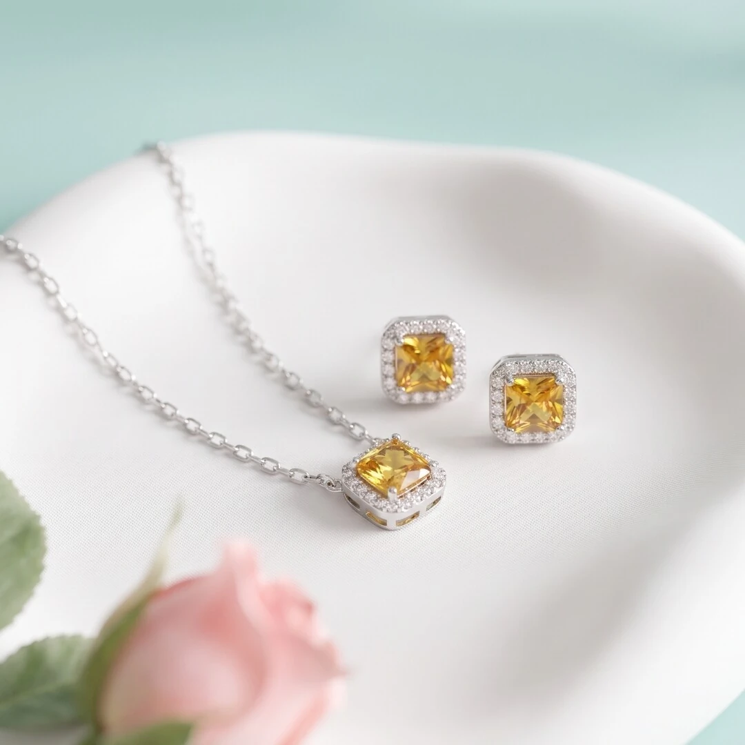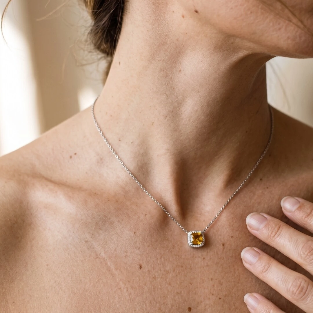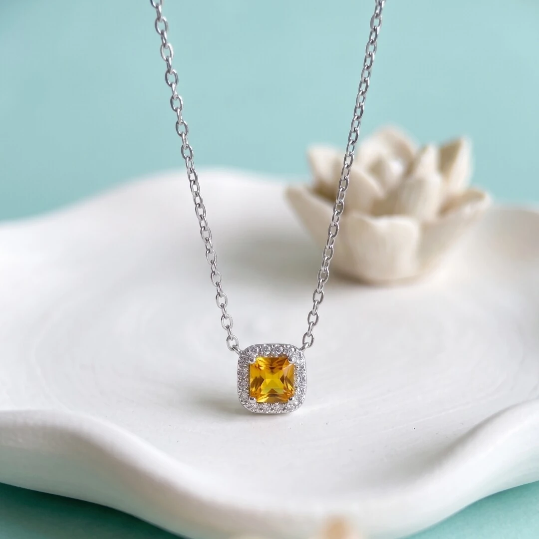 O Colar Zircônia Aperol com Halo em Prata 925 com Ródio Branco traz um pingente quadrado de 7mm em zircônia aperol — tom amarelo âmbar vibrante e quente — ao centro, emoldurado por um halo de zircônias brancas que amplificam o brilho e criam um efeito visual sofisticado e alegre.